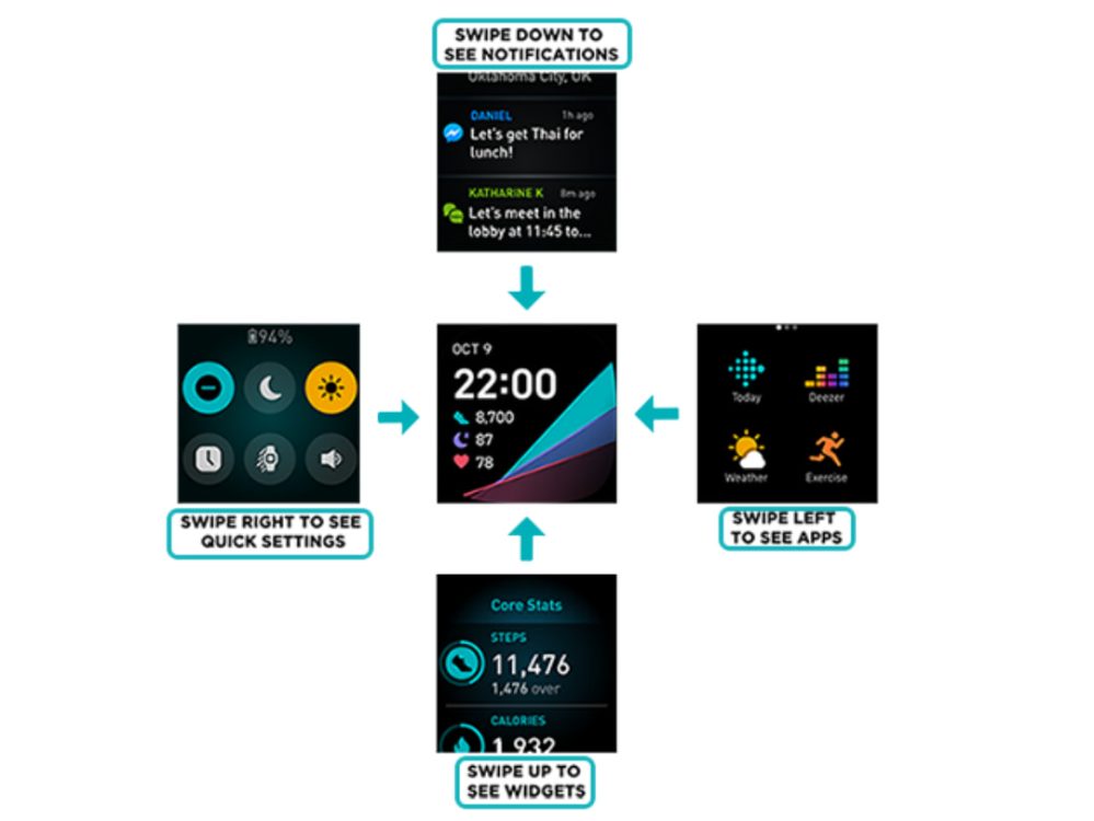 On the 2020 Sense and Versa 3, Fitbit OS 5.0 lets you swipe down from the clock face to see notifications, left for the app grid, up for health stats/widgets, and right for quick settings.