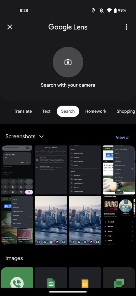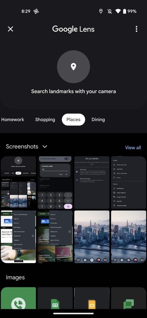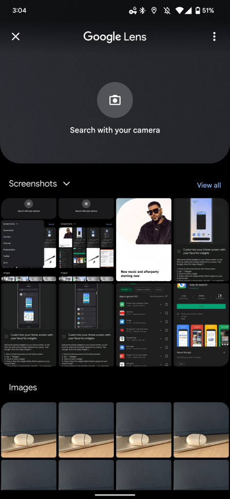 Since last year, opening Google Lens from the Search bar or homescreen shortcut on Android takes you to a three-part screen. The gallery view below shows your eight most recent “Screenshots,” while all your “Images” appear in a grid after that.