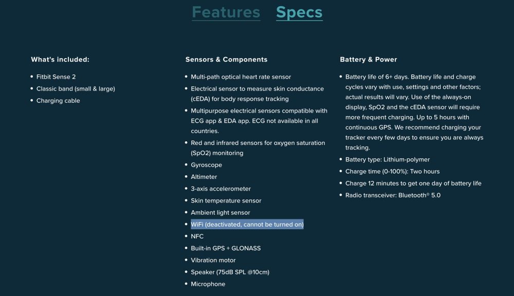 Fitbit notes the presence of “WiFi” under the “Sensors & Components” section of the Specs page for both the Sense 2 and Versa 4. However, it immediately says “deactivated, cannot be turned on” in parentheses.