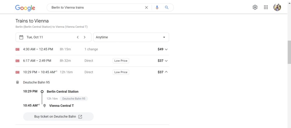 For example, searching “Berlin to Vienna trains” will display a “Trains to Vienna” module with a departure date and time picker. This list notes the agency, times, duration, and whether it’s a direct route or requires transfers. Google will also identify “Low Prices” with a tap featuring the “direct link to complete your booking on the partner’s website.”