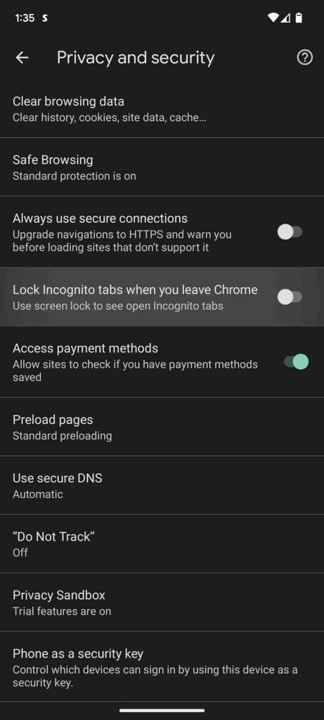 - Tap the toggle for “Lock Incognito tabs when you leave Chrome.”