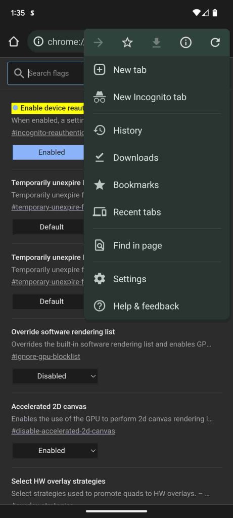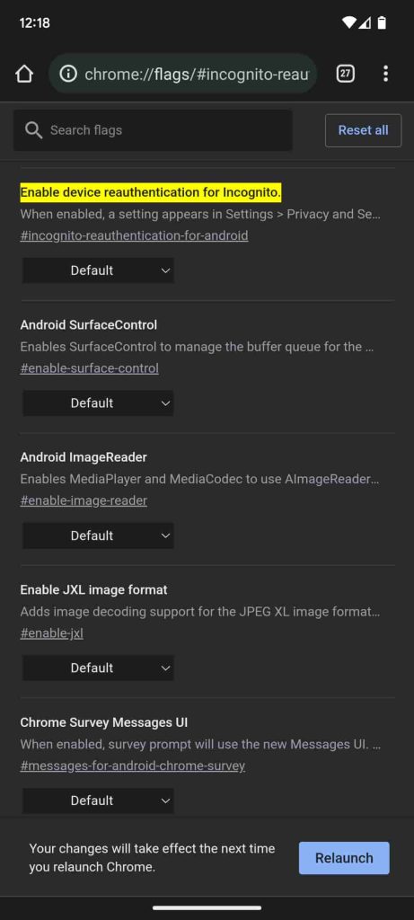 You’ll immediately see an option at the top that will turn on the fingerprint security feature. Hit Default and change it to Enabled. After that, hit Relaunch at the bottom. If the option doesn’t appear after following the next set of steps below, close Chrome and open it again several times in your recent apps drawer. The option takes a few minutes to kick in. Once it does, you’re good to go.