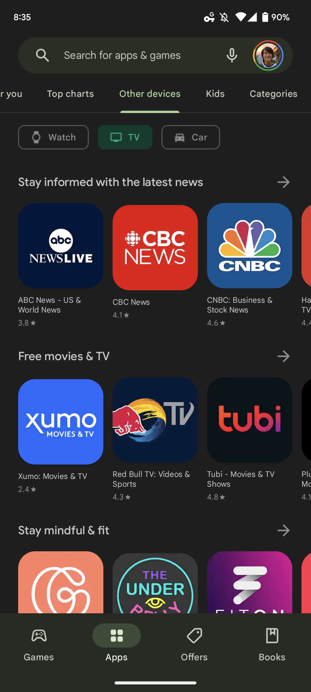 Other devices contains three sub-tabs for Watch, TV, and Car. The Wear OS section was previously (and remains) accessible from Categories > Watch apps. The feed for Android and Google TV is home to nine carousels, including: Stay informed with the latest news, Free movies & TV, Stay mindful & fit, and Listening to music you love. This new top tab also appears in Games, but just for TV where you get an image carousel design.
