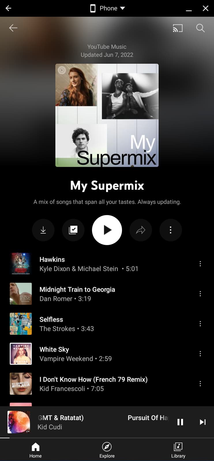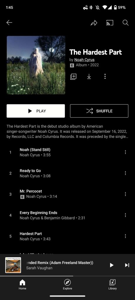 Next is a large play button that’s flanked by Download, Add to library, share, and an overflow menu. As you scroll down the track list, there’s a FAB (floating action button) in the bottom-left corner.