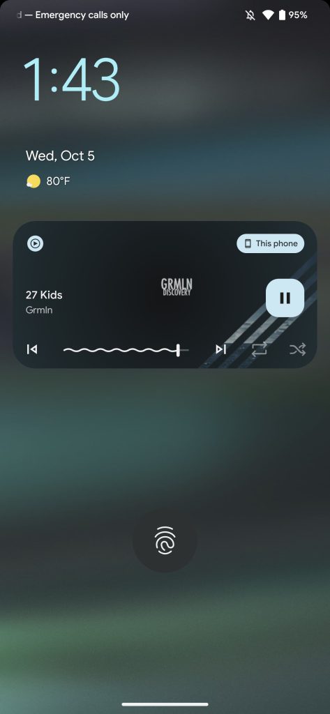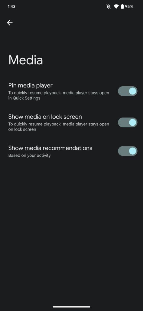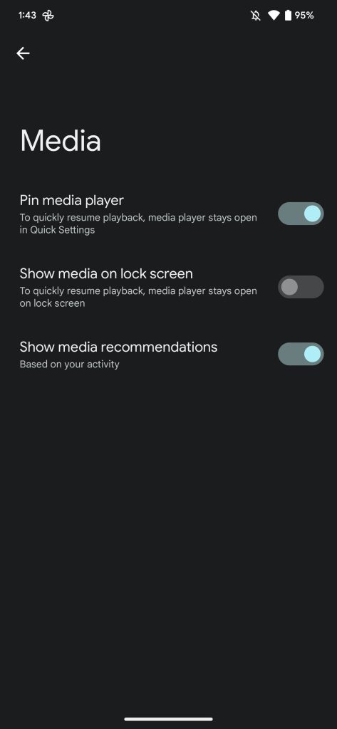 Meanwhile, Settings app > Sound & vibration > Media (or long-pressing an active media player) reveals a new “Show media on lock screen” settings. It’s toggled on by default, but disabling lets you hide the card and see more notifications when audio is streaming.