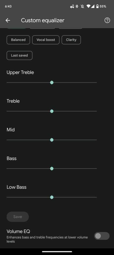 Once live, the Pixel Buds app (Sound menu) will be home to the full 5-band EQ promised at launch. You’ll get sliders for five different frequency bands (Upper Treble, Treble, Mid, Bass, Low Bass), and a brief demo was shared on Twitter this morning.