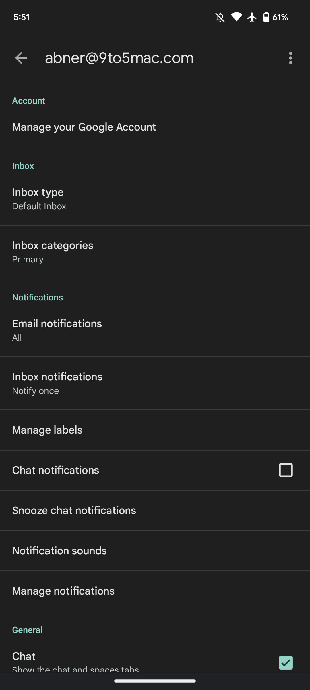 App-level settings (like theme and mail swipe actions) are considered “General,” while everything else requires opening account settings. That’s further split into sections like Account, Inbox, Notifications, General (again), Meet, Nudges, Inbox Tips, and Data usage for a rather long list.