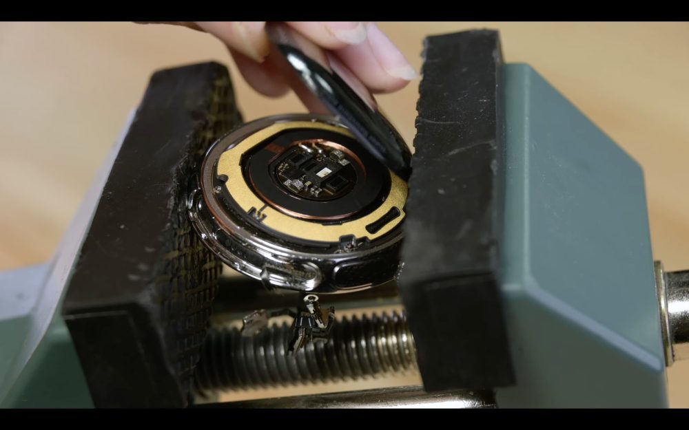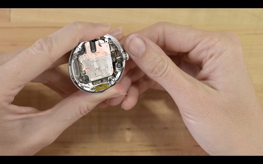 iFixit starts by heating the top glass to loosen the adhesive, which is said to feel “surprisingly loose but as we peel off the last bit it does have some grip so hopefully that IP rating holds up.” [The Pixel Watch is officially good to 5 ATM.] The stainless case appears to have a partially raised lip.