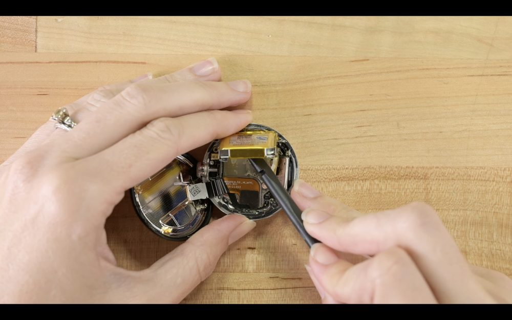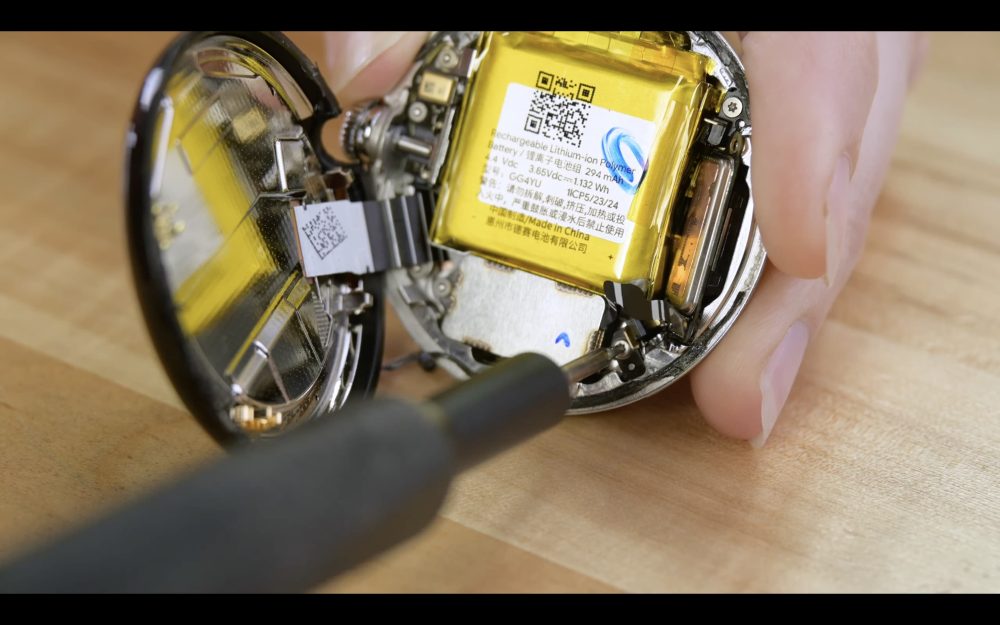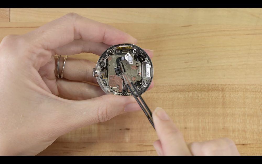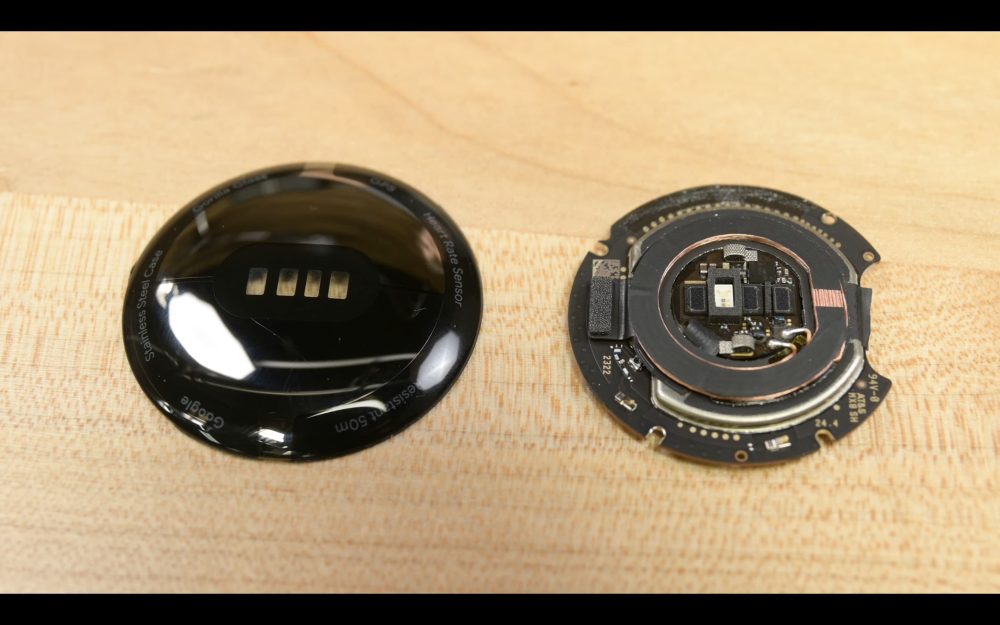 The motherboard features health sensors soldered to its underside and requires prying off the back dome and several screws. That back glass, which features residue-less adhesive, is entirely replaceable as a result. iFixit was not able to remove the crown, side button, or test port from the stainless steel case, which is seen in the design photos shared by Google in our cover image.