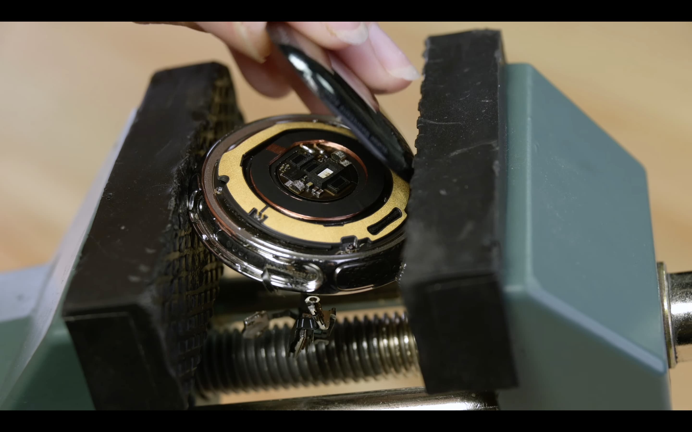 iFixit starts by heating the top glass to loosen the adhesive, which is said to feel “surprisingly loose but as we peel off the last bit it does have some grip so hopefully that IP rating holds up.” [The Pixel Watch is officially good to 5 ATM.] The stainless case appears to have a partially raised lip.