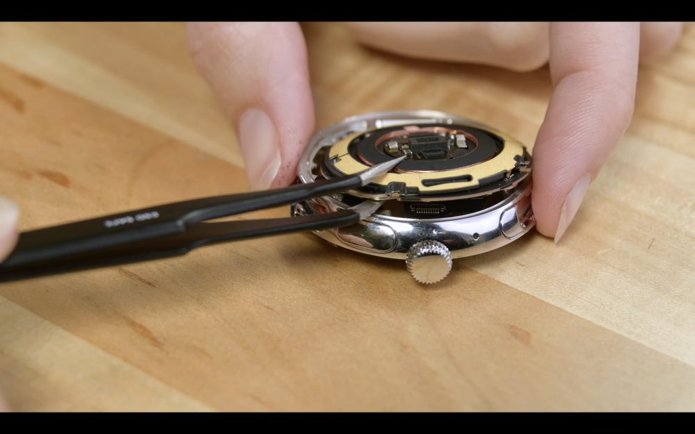 The motherboard features health sensors soldered to its underside and requires prying off the back dome and several screws. That back glass, which features residue-less adhesive, is entirely replaceable as a result. iFixit was not able to remove the crown, side button, or test port from the stainless steel case, which is seen in the design photos shared by Google in our cover image.