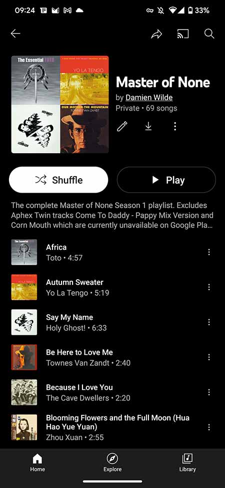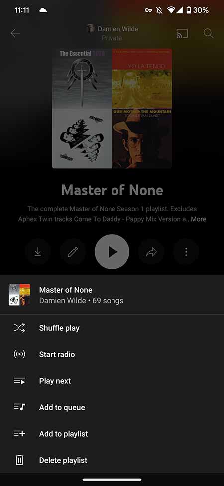 Underneath this section, you’ll find larger, more prominent controls to download, edit, share, and access more information. These outline-style buttons surround a larger “Play” button that initiates playback. Oddly, the “Shuffle” button is not present with this redesign. To access this, you actually need to tap the overflow three-dot button. That is certainly a frustrating change as part of the YouTube Music playlist redesign that will likely cause some confusion for users.