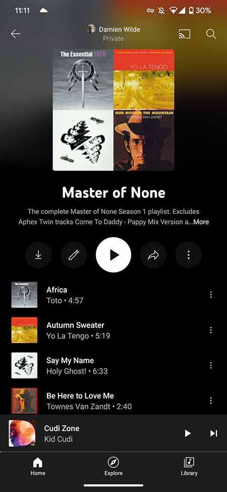 Underneath this section, you’ll find larger, more prominent controls to download, edit, share, and access more information. These outline-style buttons surround a larger “Play” button that initiates playback. Oddly, the “Shuffle” button is not present with this redesign. To access this, you actually need to tap the overflow three-dot button. That is certainly a frustrating change as part of the YouTube Music playlist redesign that will likely cause some confusion for users.