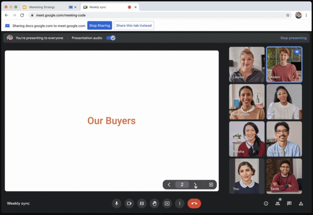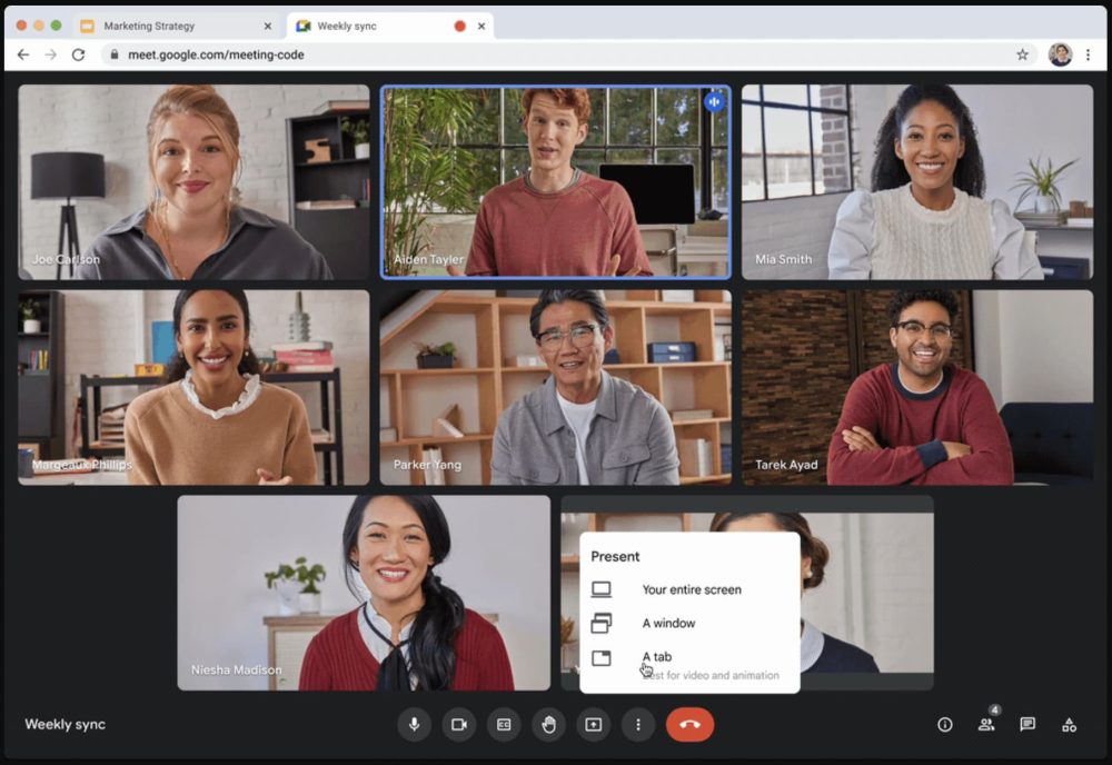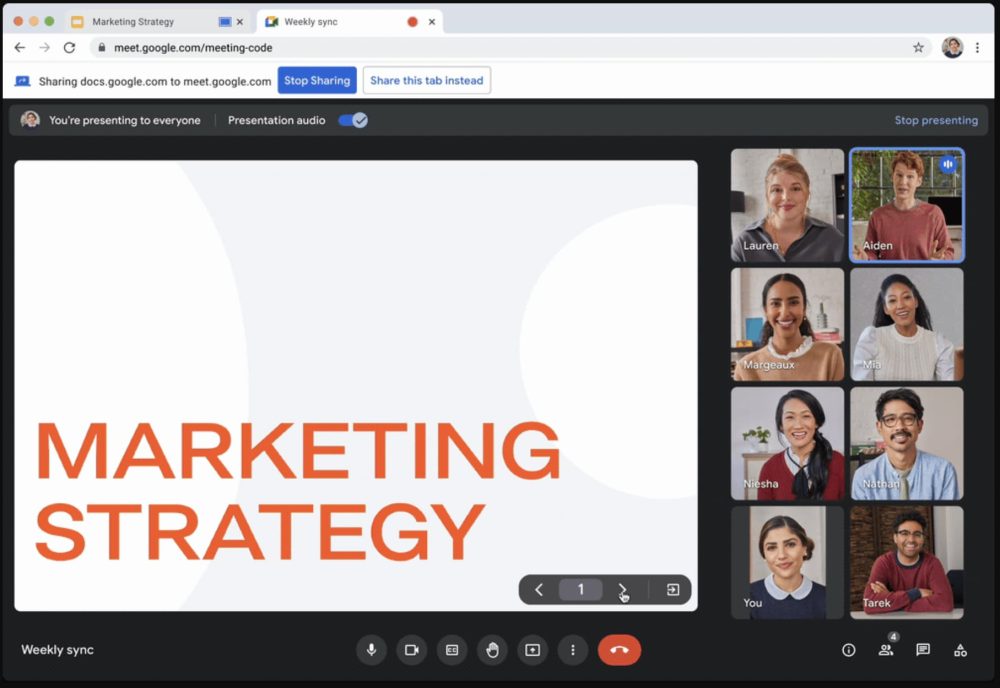 Meanwhile, Google — as announced during Cloud Next 2022 — will let you present Slides directly in Meet. Once triggered from the Present menu, select the Tab option, and then your open presentation. You will get next/last control in the bottom-right corner with the deck taking up most of the Meet UI. Video calling controls appear at the bottom and a grid of video feeds appear at the right. It will go live in the coming weeks. Availability is outlined below: