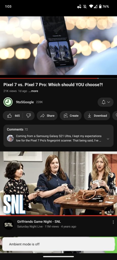 The next set of changes are on the video page. By default, Ambient mode is enabled so that the top and bottom of what you’re watching bleeds into the status bar and video description below, respectively. It will take some time to get used to and works best with vibrant colors versus dull ones. Fortunately, you can disable it by tapping the settings gear in the top-right corner and tapping the fourth item in the menu.