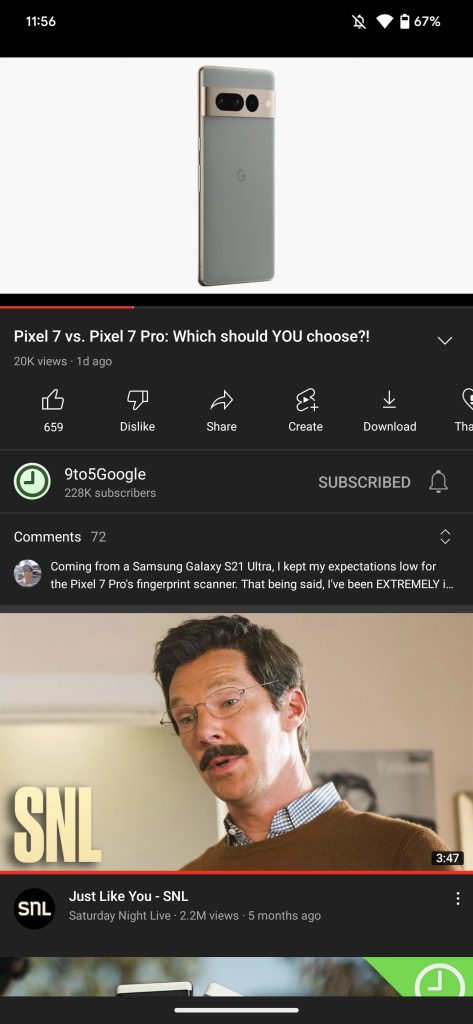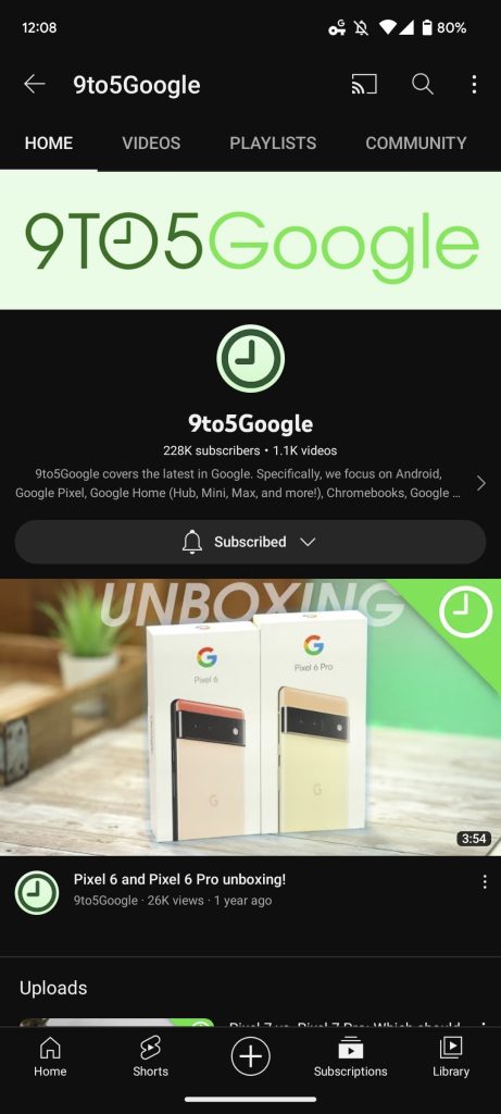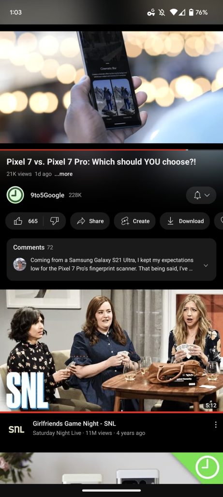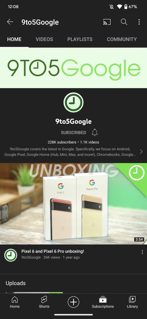 If YouTube’s dark theme is enabled, the first change you’ll notice is how the background is darker (#0F0F0F), though not completely black. This matches YouTube Music and is something people have long wanted in the mobile apps.