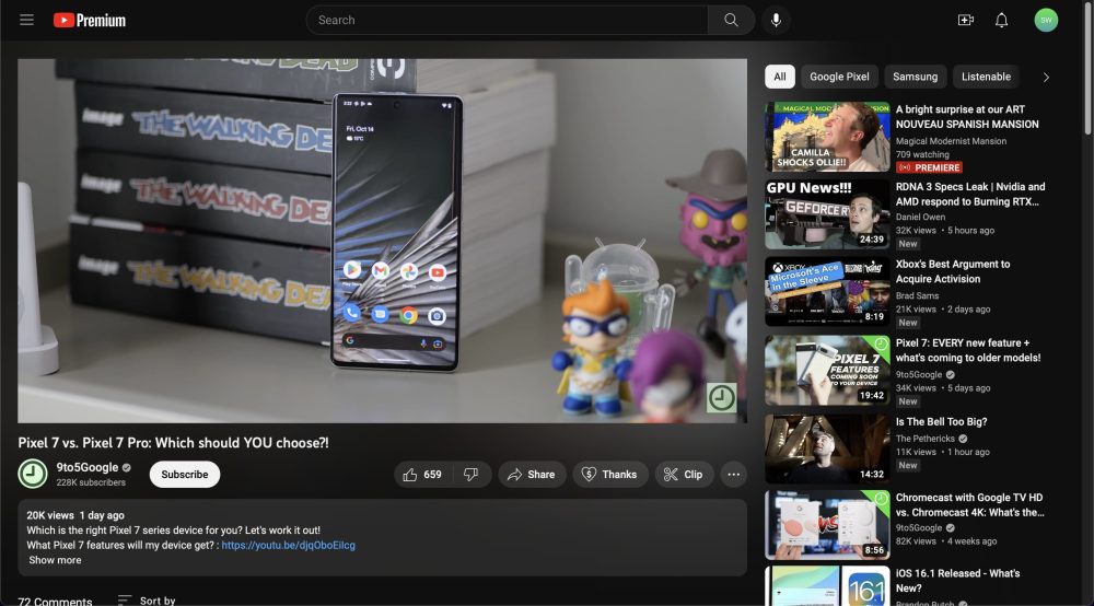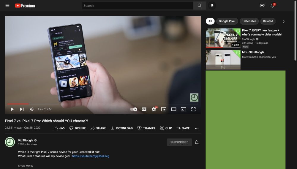 Beyond the darker theme, the video page gets similar tweaks to the layout below the video while Ambient mode is a bit nicer here. This bleeding extends to the side feed of videos and comes off as rather elegant on a large screen.