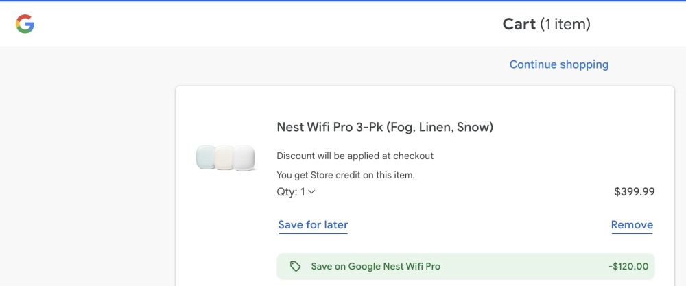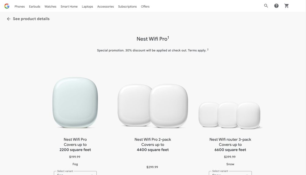You can only make one Nest Wifi Pro order with this discount, but it can be a single unit, two-pack, or three-pack, and there’s the ability to select colors.