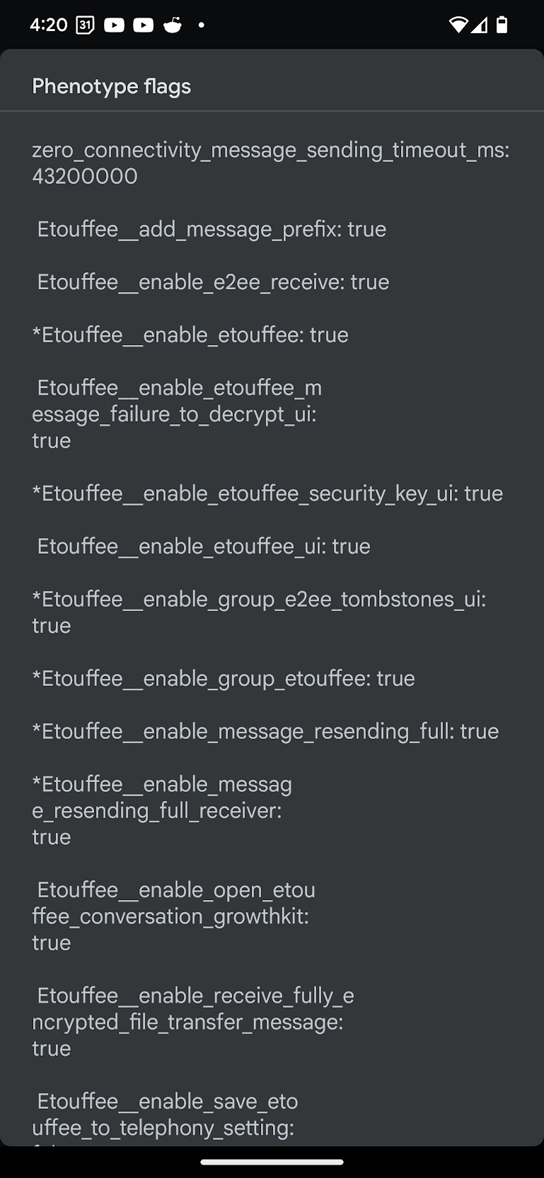 A debugging menu, seen below, shows if E2EE is enabled on your device for group chats, but there’s no easy way to tell at this point, or to force it.