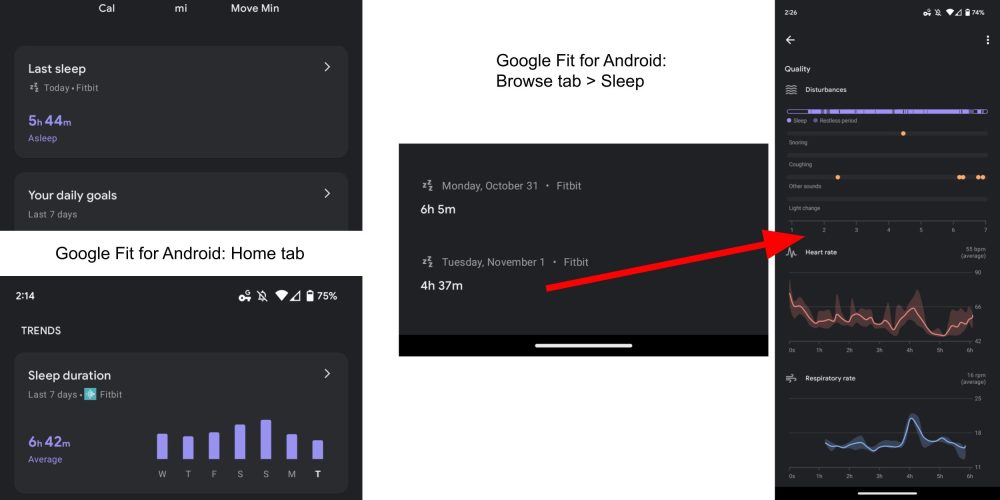 Meanwhile, on Google Fit for Android, the experience is somewhat stranger with only one session per night appearing in the Browse tab > Sleep > Sleep duration. This app does label where the data is coming from with either “Fitbit” or its icon. The Fitbit page does show “Disturbances” from the Nest Hub, but not sleep stages from either source.