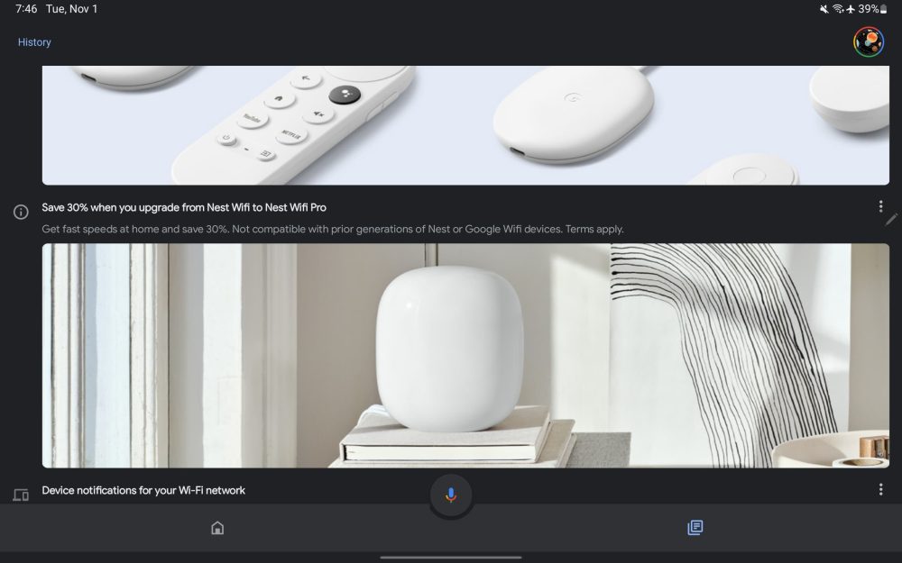 Look for the “Save 30% when you upgrade from Nest Wifi to Nest Wifi Pro” card in the Google Home app’s Feed tab, which was redesigned earlier this year: “Get fast speeds at home and save 30%. Not compatible with prior generations of Nest or Google Wifi devices. Terms apply.”