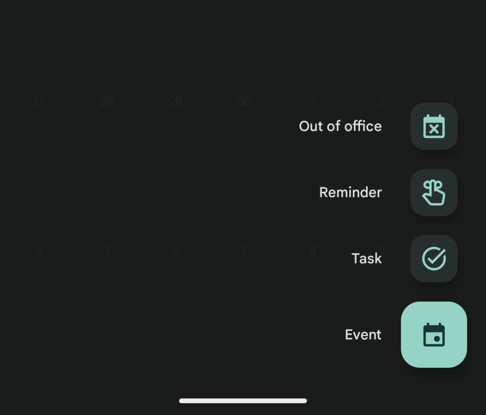 Original 8/3: “Goal” appears in the mobile FAB (Floating Action Button) list alongside “Event,” “Task,” “Reminder,” and “Out of office” (on Workspace accounts). Tapping prompts you to choose a goal: