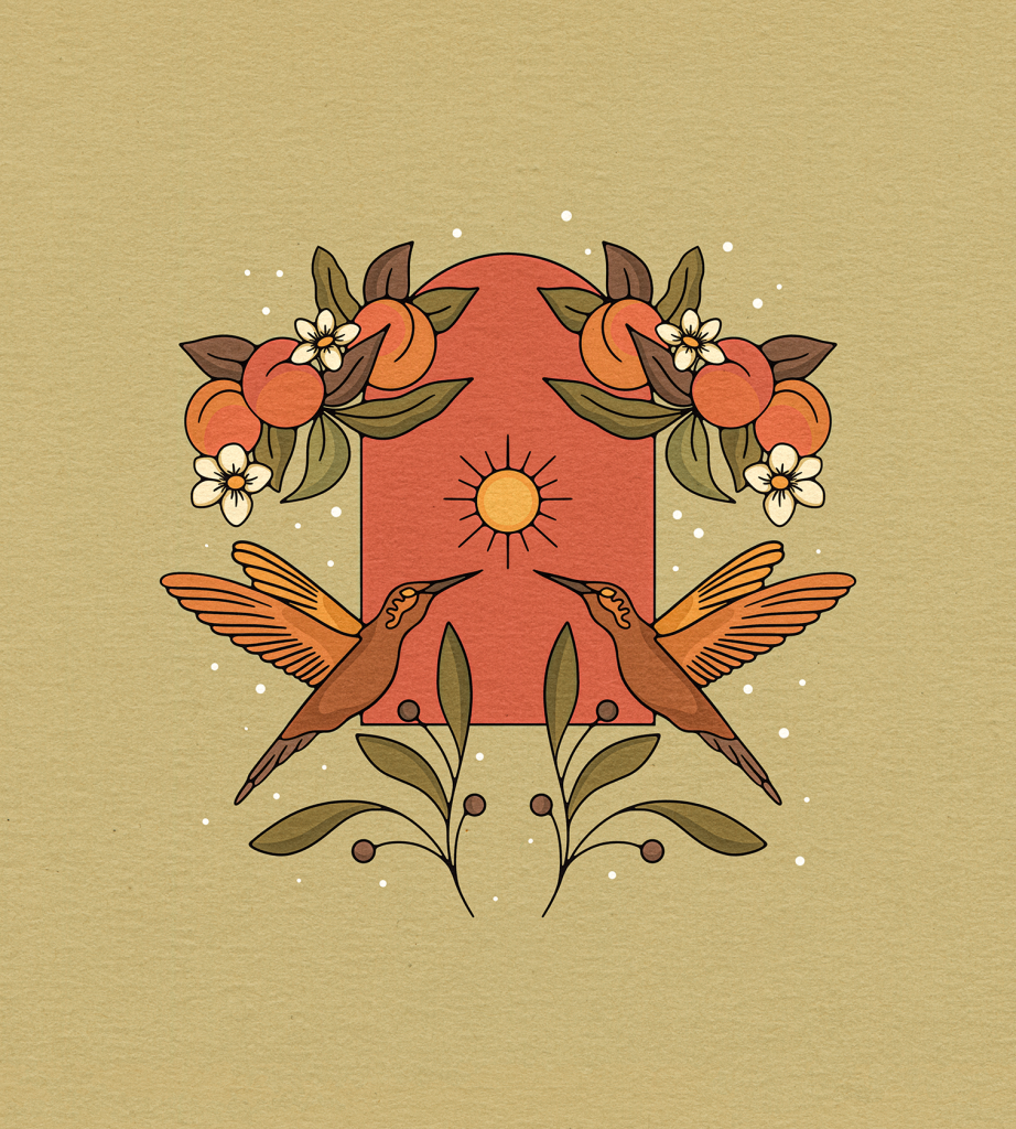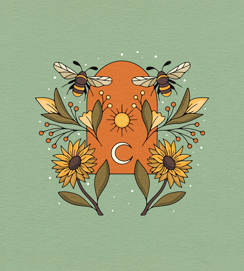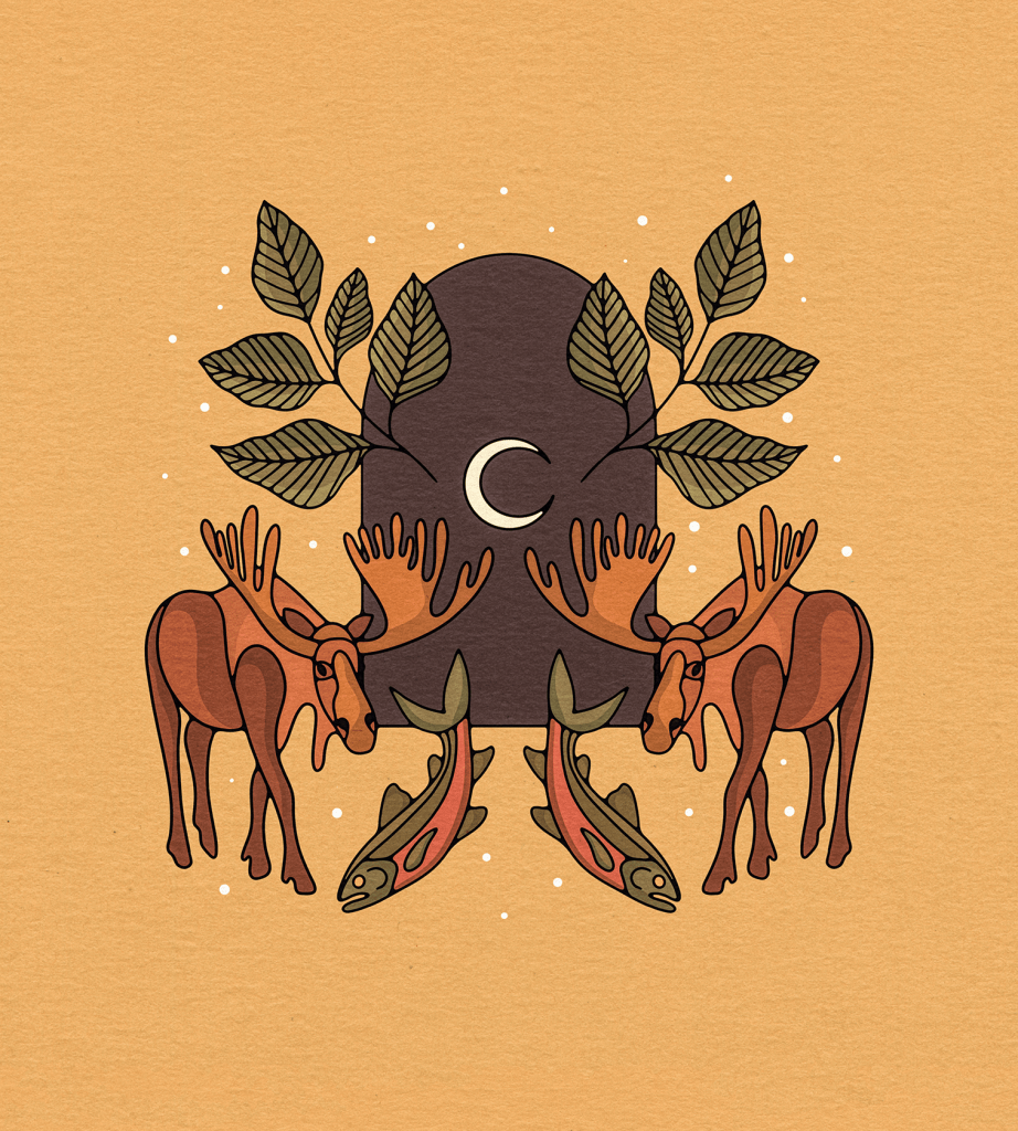 “I feel so inspired by the land, and often use pieces of our natural world in my work like plants, animals, the sun and moon, the water, fire-and like to illustrate how our relationship with everything around us is so complex and intricate.”