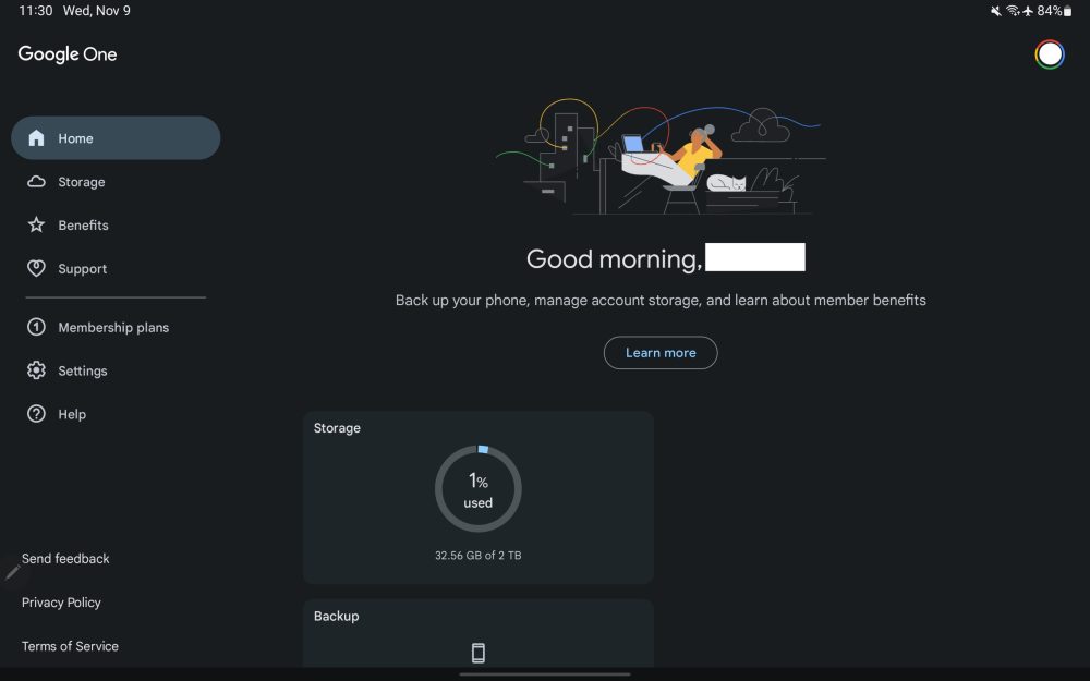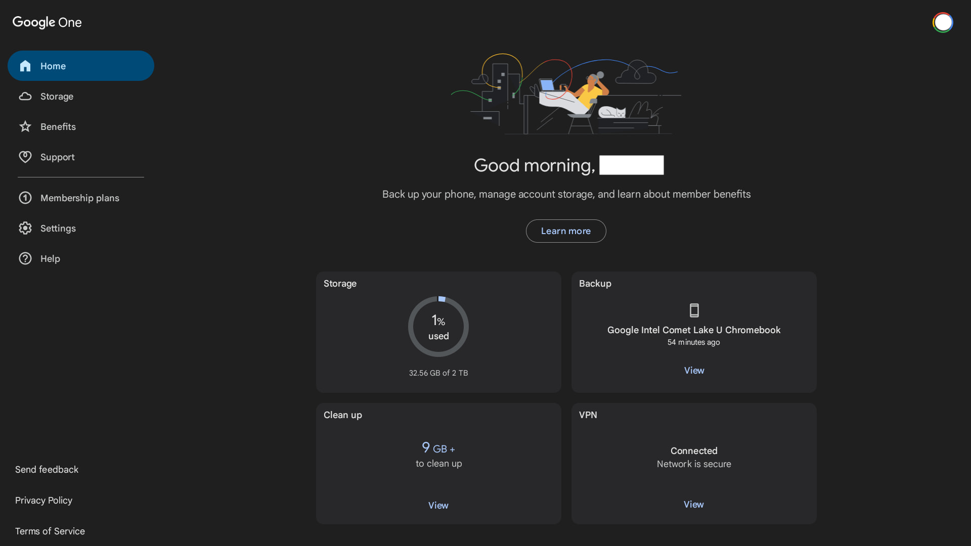 The Google One logo appears in the top-left corner with Home, Storage, Benefits, and Support, appearing first as the core parts of the application. There are also links to Membership plans, Settings, and Help, as well as Send feedback, Privacy Policy, and Terms of Service. It very nearly lines up with one.google.com and makes for a consistent experience.
