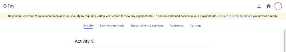 Visiting pay.google.com today reveals a yellow banner: “Beginning December 9, we’re increasing account security by requiring 2-Step Verification to view any payment info. To ensure continued access to your payment info, set up 2-Step Verification if you haven’t already.” This 2FA prompt appears for all Google Pay visitors, even if you have your account secured.