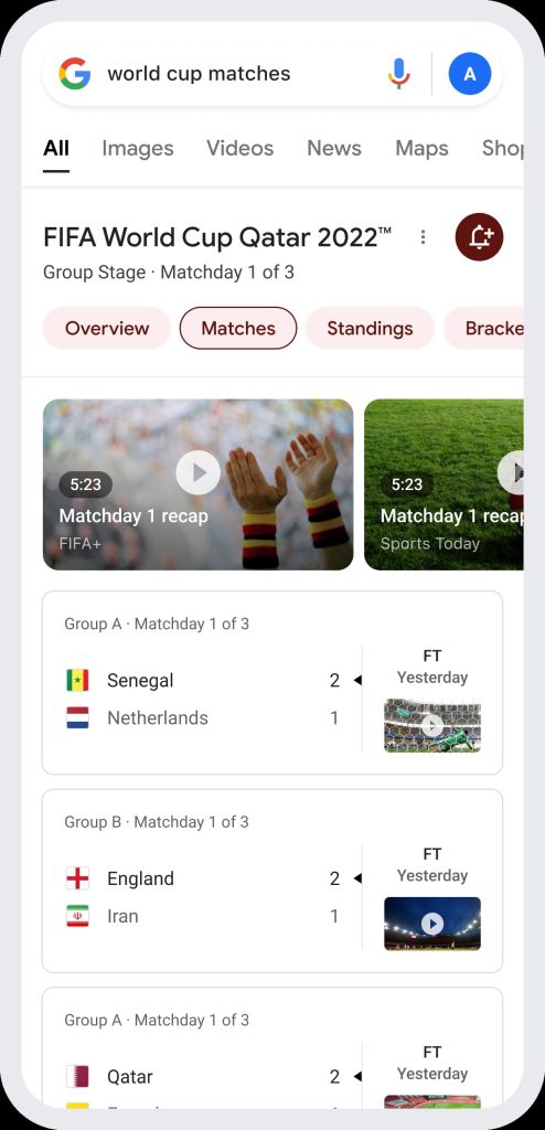 Google suggests that you search for your favorite (national football) team and then tap the bell icon in the top-right corner to receive notifications. Matches will include in-depth stats, win probabilities, and a timeline to keep track if you’re not watching live. There will also be “daily recap videos directly on Search from FIFA+ and official broadcasters including beIN SPORTS, BBC, ZDF and more.”