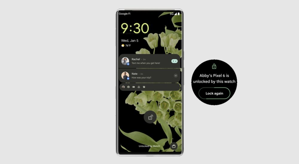 When your watch is unlocked and brought near the paired mobile, you’ll get a “[phone] is unlocked by this watch” notification that features a “Lock again” button to cancel. On the phone’s lock screen (at the bottom), you’ll also get an “Unlocked by Watch” notification.