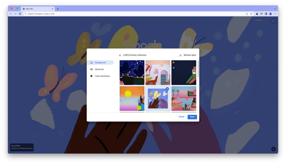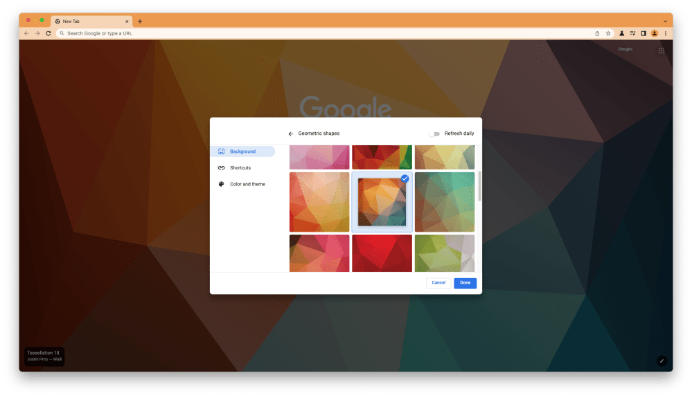 Once enabled, any time you change to a new background image, the whole of Chrome will switch to a complementary color theme. Notably, the theme only changes when switching to a background from one of the collections that Google provides. If you try to use a picture of your own, Chrome will stay on its previous theme.