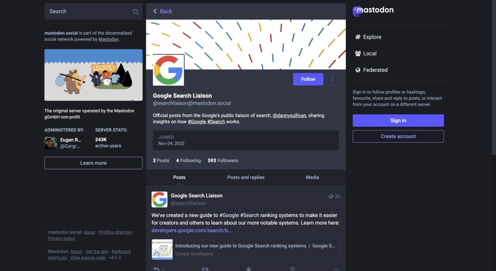 @searchliaison@mastodon.social joined the main server on November 4 and has so far tweeted three times. Today’s post, which was cross-posted, about a “new guide to Google Search ranking systems to make it easier for creators and others to learn about our more notable systems” caught our attention. Meanwhile, mastodon.social/@searchliaison even makes an appearance on Google’s @searchliaison Twitter account.