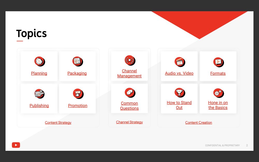 As spotted by Morning Brew’s Jake Appleby, this 67-page slide deck is quite in-depth with a “confidential & proprietary” label. Right off the bat, YouTube notes how “these best practices are tips to guide you that we have gathered from what has worked previously on the platform, but they are not a guarantee for success.”