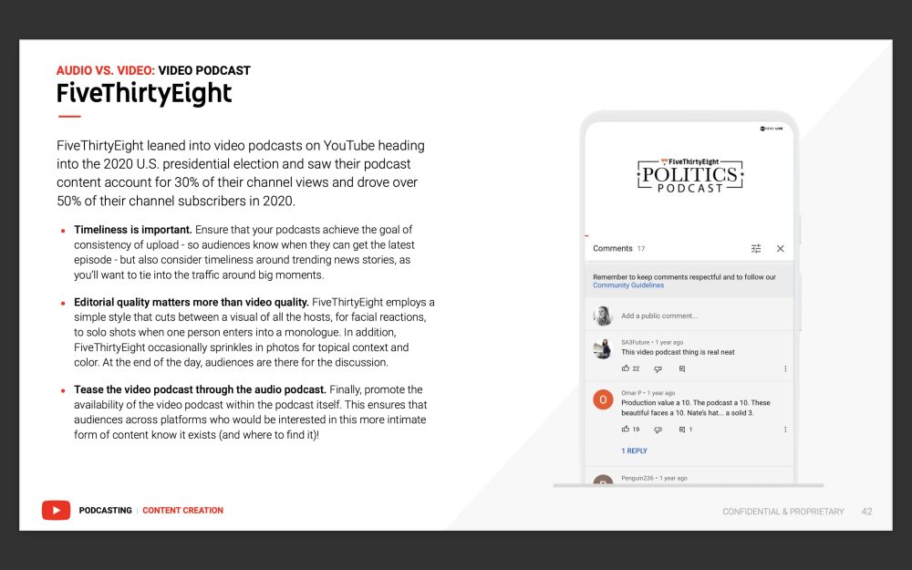 In Content Creation, Google explicitly says (page 39) “YouTube Audiences Show A Preference For Video Podcasts Over Audio Podcasts.” It explains the distinction between audio and video-first production with Bloomberg and FiveThirtyEight used as case studies. There are slides discussing good video and audio production design, as well as the use of transcripts and captions.