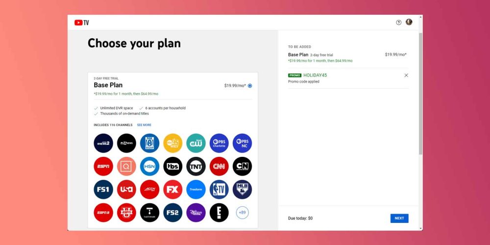 YouTube TV is currently running a holiday deal wherein if you sign up with the code HOLIDAY45, you can get $45 off your first month of coverage. That leaves you with a $20 bill at the end of the month. Additionally, YouTube TV automatically gives you two free days prior to charging you the $20. If you decide you don’t want it, you can back out before that $20 gets billed.