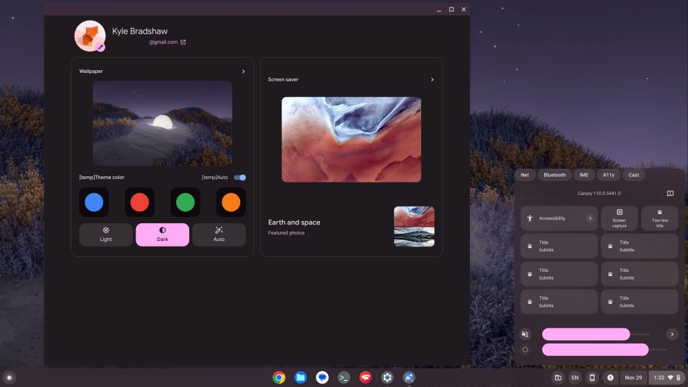 In the corner of the screenshots above, you’ll notice a massively overhauled quick settings area. As the “Title” and “Subtitle” text should suggest, this is still very early in development. Setting that aside, quite a bit has changed from what’s live in ChromeOS today.