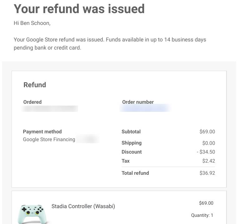 So far, it seems that most folks are only seeing one or two refunds for Stadia hardware, with an email receipt confirming the refund status. As with game refunds, Google is issuing the credit back to the original form of payment.