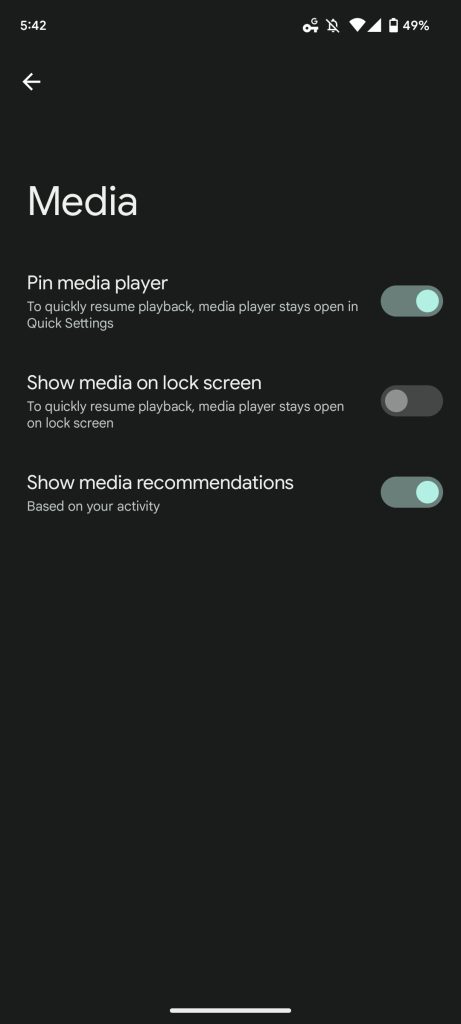 QPR1 contains some user-facing changes, starting with the ability to remove the media player from the lockscreen. “Show media on lock screen” can be toggled off from Settings app > Sound & vibration > Media. (The double-line clock still gets minimized when music is playing.) Speaking of the media player, Android 13 QPR1 tweaks it so that the scrubber is now a pill instead of a circle that some thought looked like sperm.