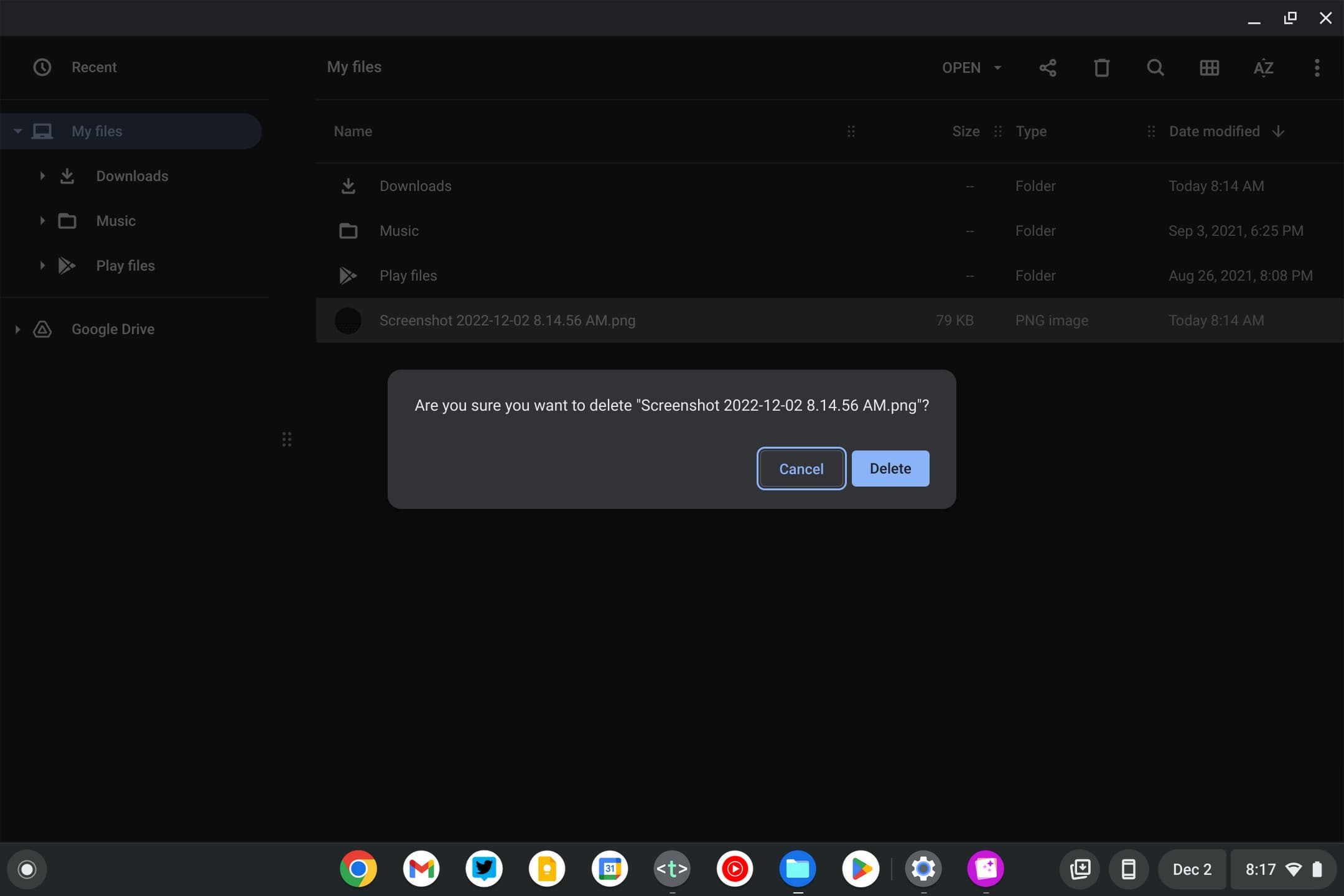 Original 12/2: Previously, deleting files was final and involved ChromeOS first showing the “Are you sure you want to delete [file]?” prompt with a confirmation step, which was set to “Cancel.” (That was a good default for most users, but made for a slow workflow.) After you clicked “Delete,” the file was gone permanently.