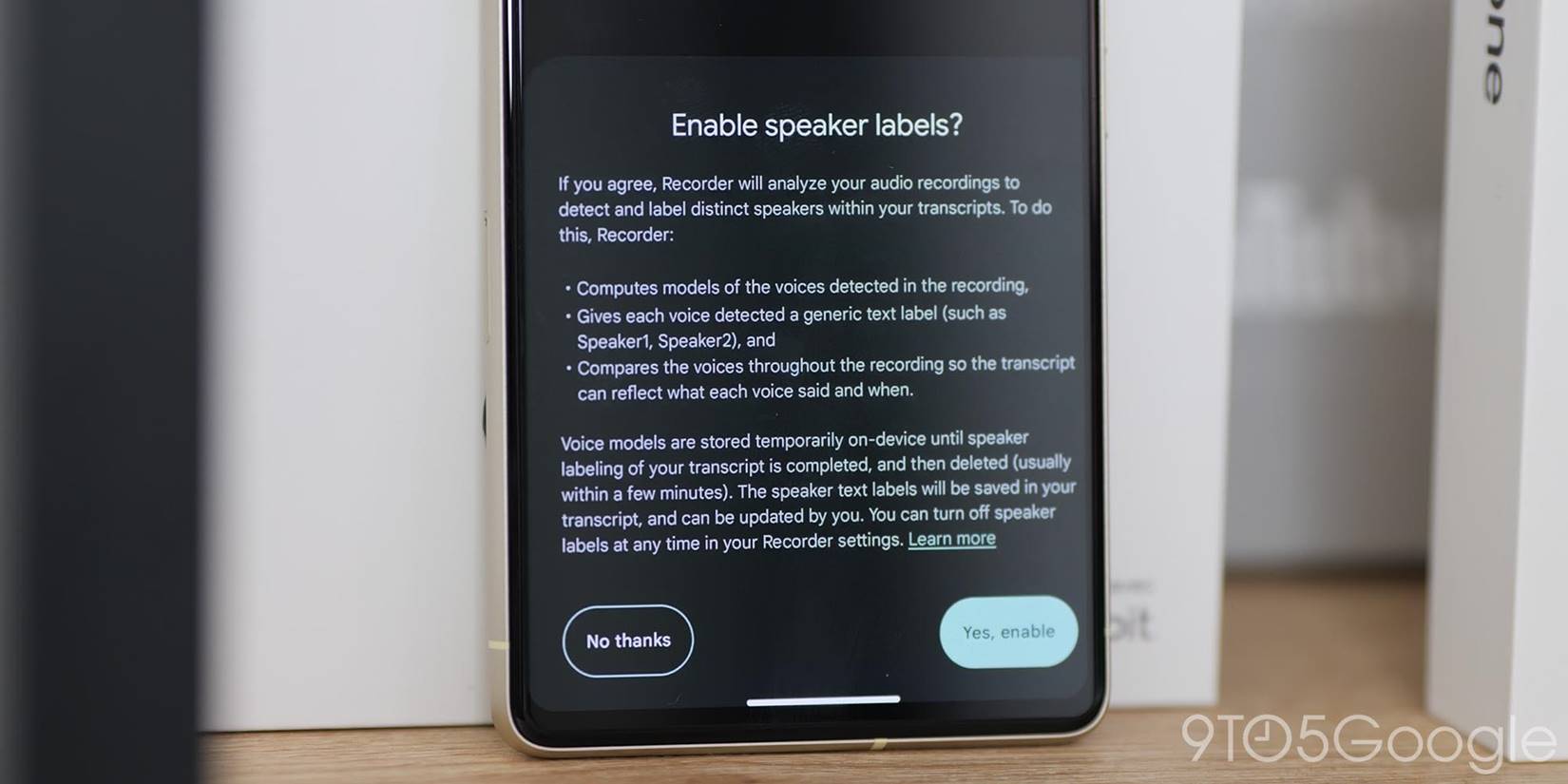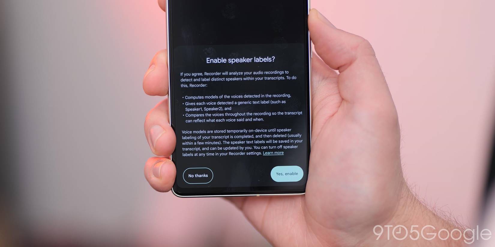 People are identified as Speaker 1, Speaker 2, etc., and you can “change the name for each speaker in the recording.” They are also identified in the feed with different name colors and Material You shapes. Notably, Speaker labels will not work if your “device is too hot.”