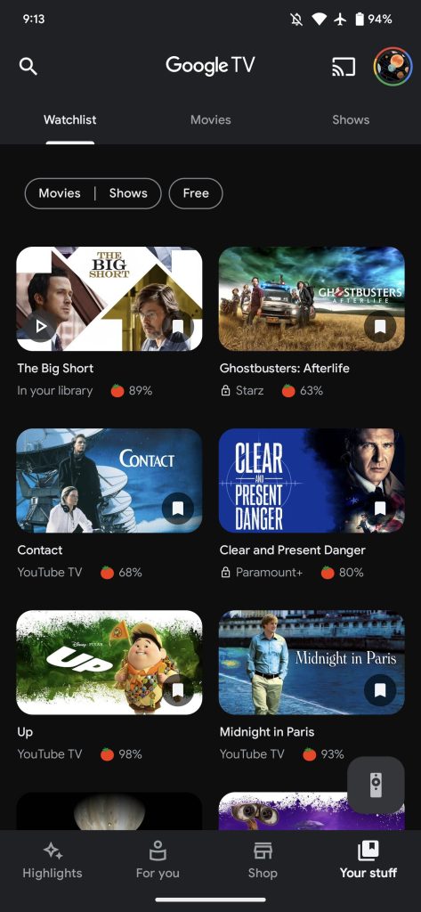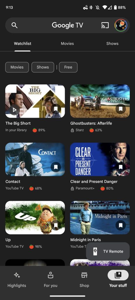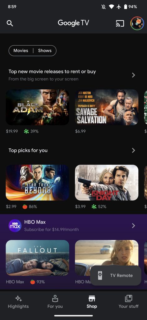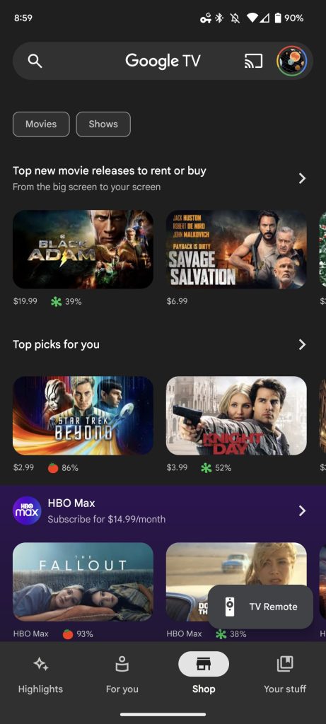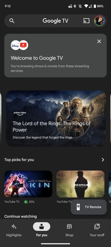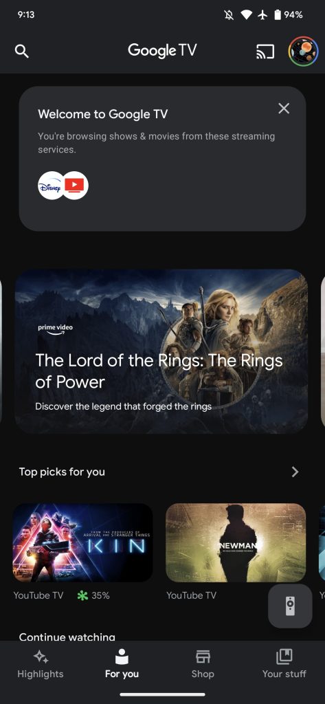 Meanwhile, the app bar has been entirely revamped with a search field that spans the entire width of the screen. “Google TV” remains centered in the bar and does not disappear or show a search hint like in other apps.