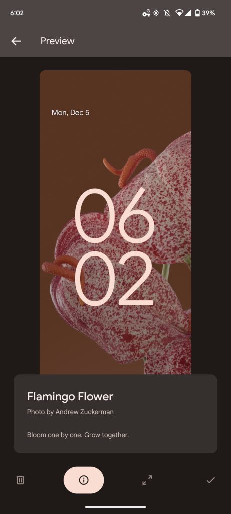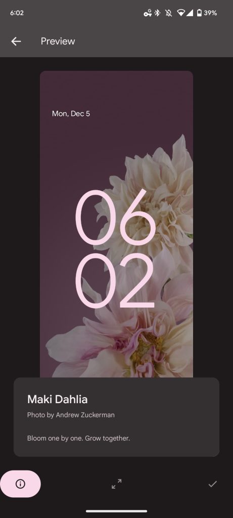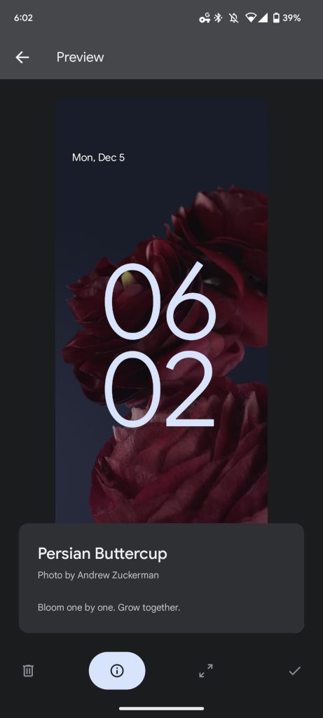 Live Bloom consists of four wallpapers that bring “your Pixel screen to life with images that shift and sway when your phone moves.” The photos are by Andrew Zuckerman with a “Bloom one by one. Grow together” caption: