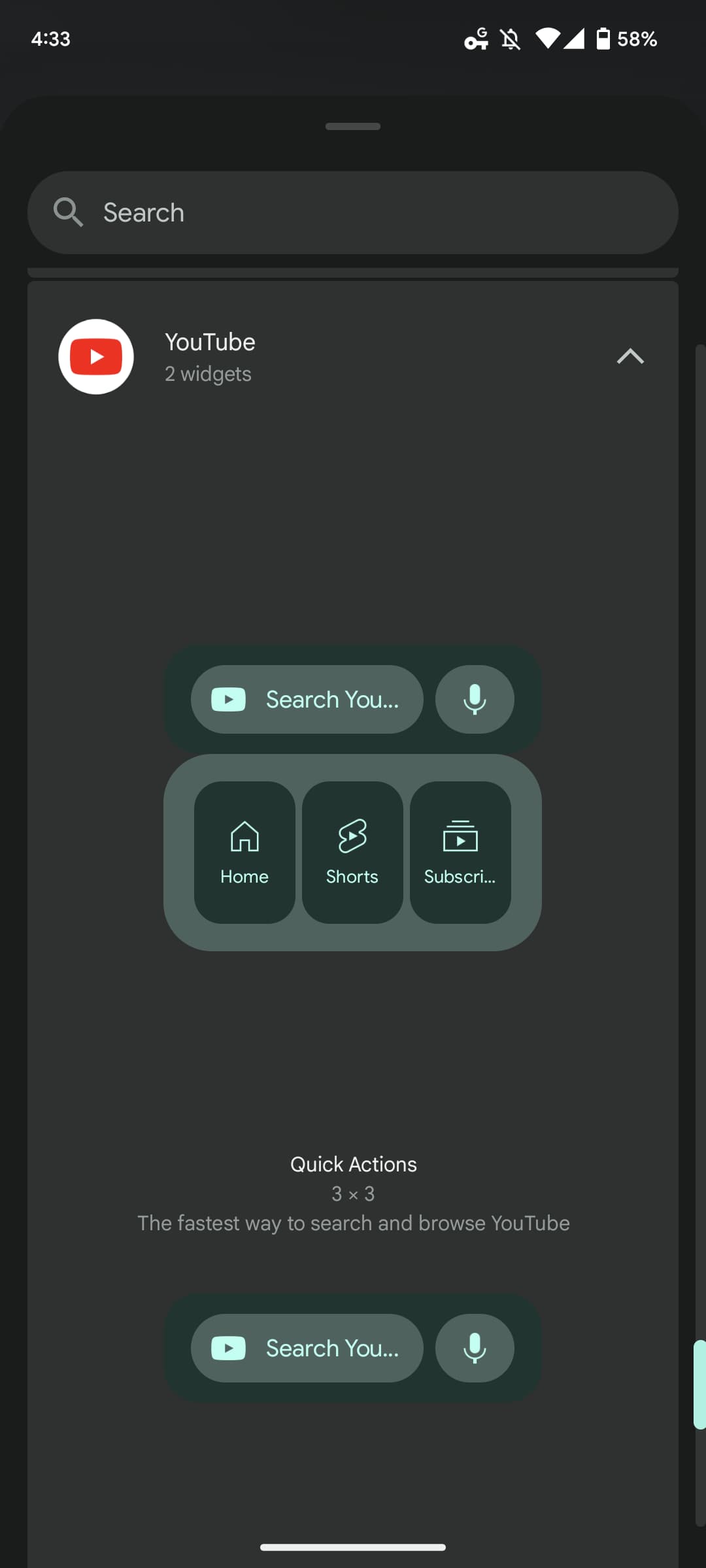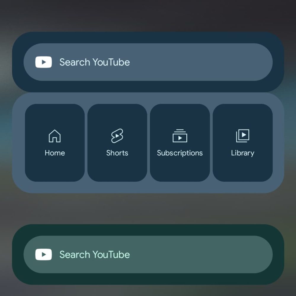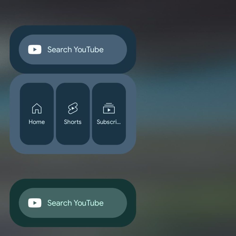 If you just want that functionality, use the “Search” widget. There’s also “Quick Actions” with the exact same search field, as well as one-touch access to the Home, Shorts, Subscriptions, and Library tabs/feeds. The latter disappears if you shrink the widget to 3×2.