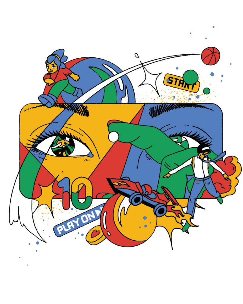 This simple black T-shirt features an illustration in the four colors of the Google Play logo. It features the “10” used to mark a decade of Play and various other gaming nods, including a race and PUBG.