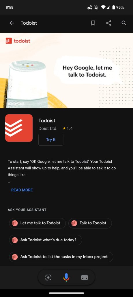 Google itself wants developers to add voice control capabilities to their existing Android apps. Todoist says its “app on your Android mobile device is automatically integrated with your Google Assistant.” This supports: