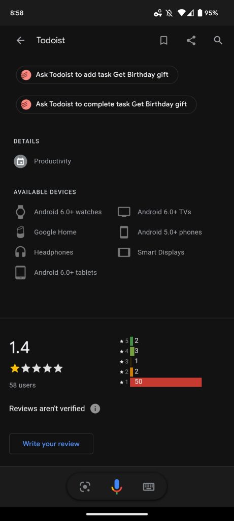 The company explicitly says “it’s not possible to use Todoist with Google Assistant on smart home devices, iOS devices, or Wear OS devices.” This previous integration was invoked by “Talk to Todoist” and commands like: