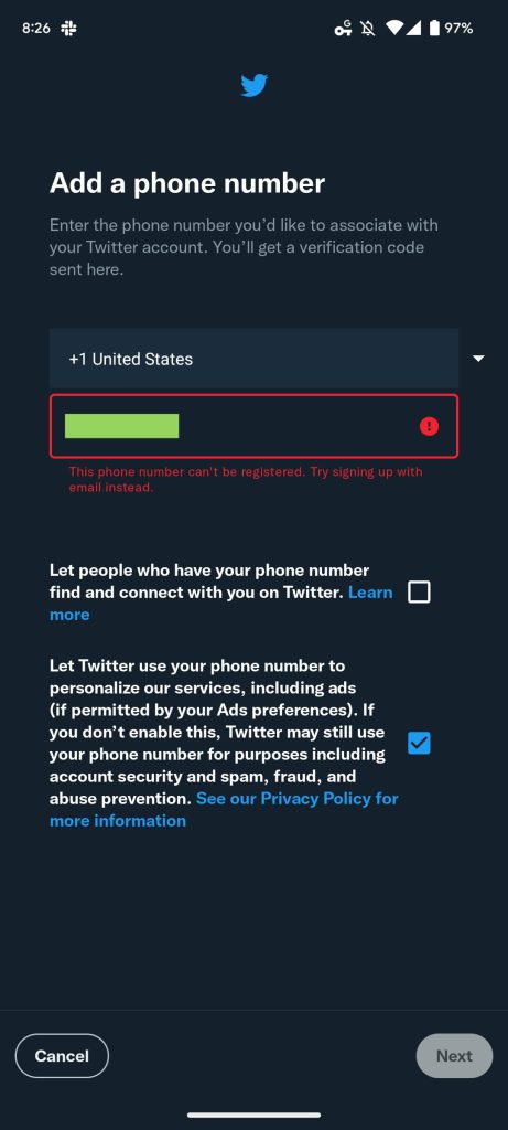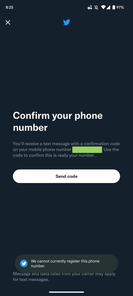 After removing that number from an account and trying to re-add it, Twitter says: “This phone number can’t be registered. Try signing up with email instead.” Everything worked normally with a regular carrier number. Twitter should do a better job with error messages.