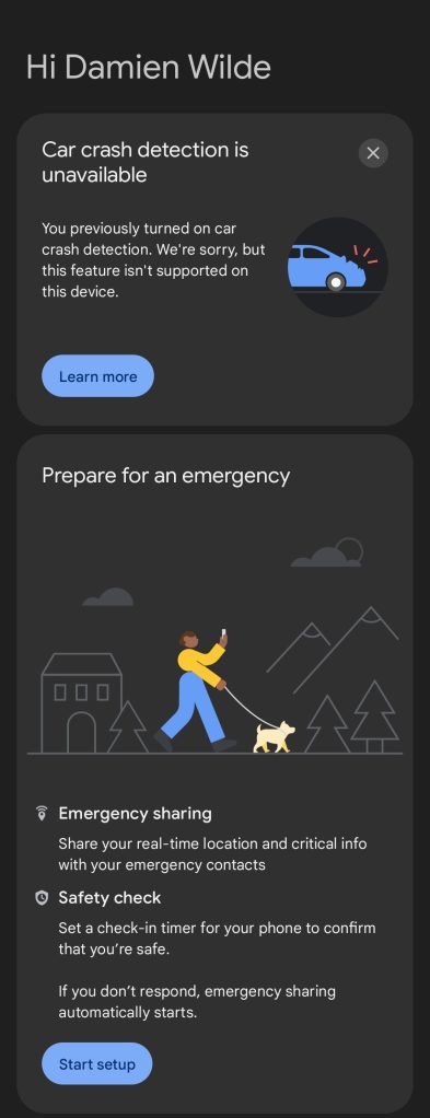 From there, as expected, you can manage your emergency information and get enrolled for alerts. However, for all currently supported phones, the Android 13 update does not bring the car crash detection that Personal Safety is best known for.