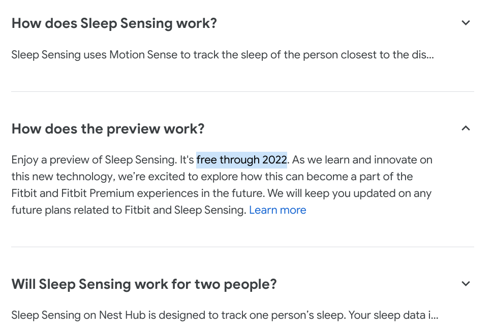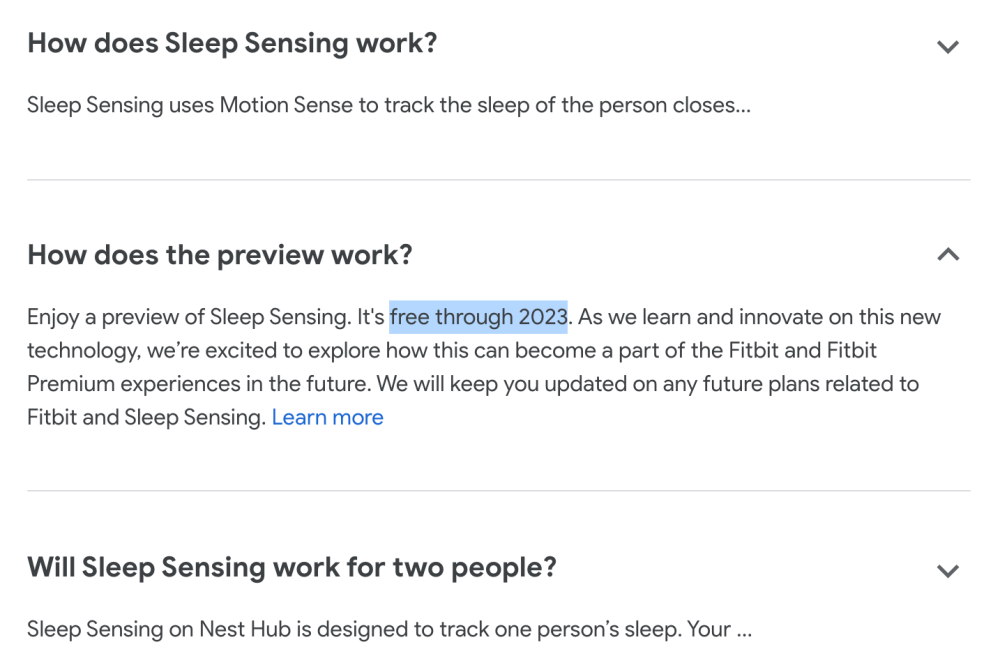 It’s a nice sleep tracker for those that don’t want to wear anything on their wrist. That said, if a user already has a smartwatch they wear to sleep, it’s not clear that Sleep Sensing is valuable enough to pay for. Google will eventually require Fitbit Premium to use and that’s currently $9.99 per month or $79.99 per year.